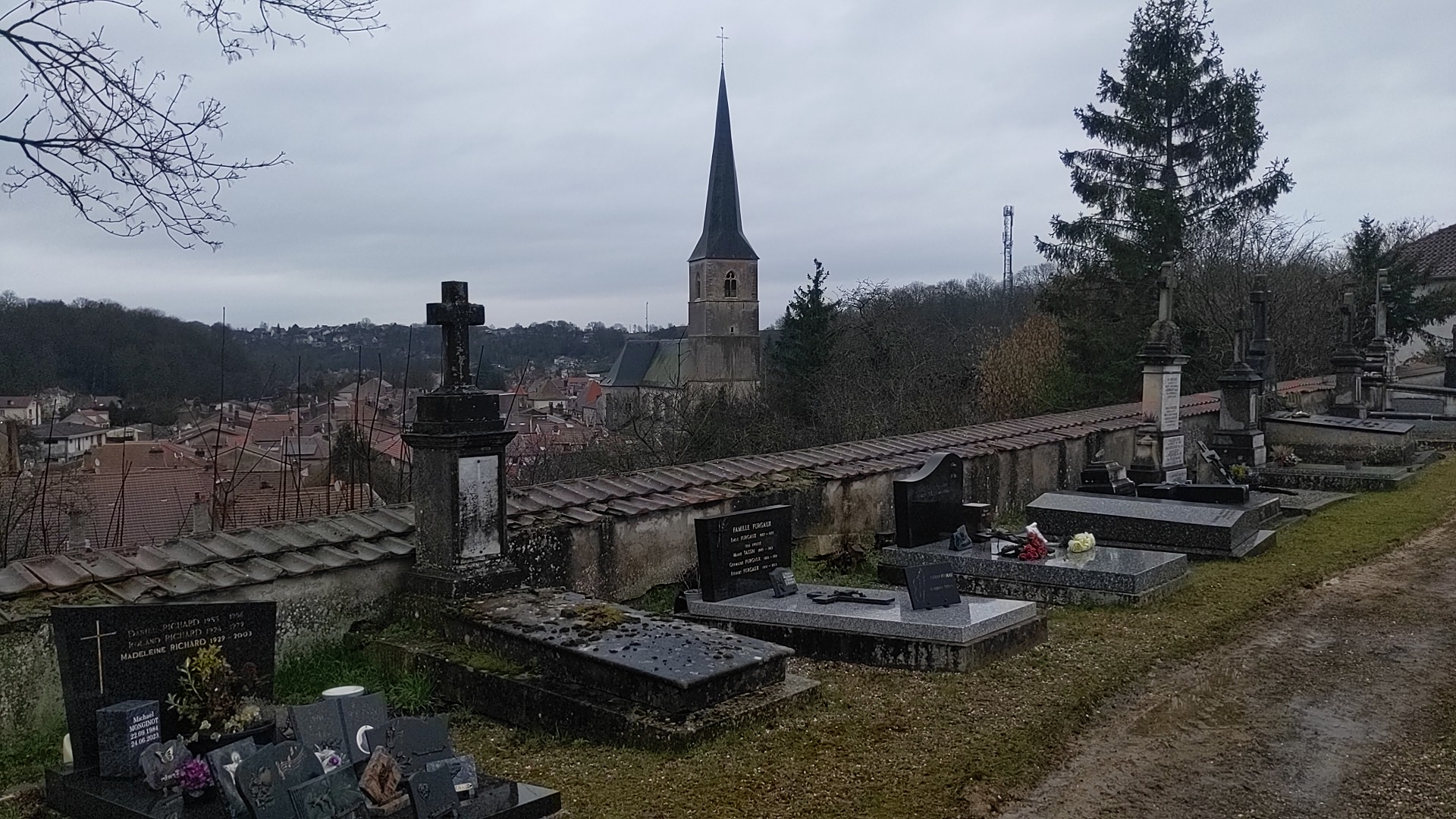 Jolie cimetière à flanc de coteau belle vue sur l'église de Vézelise mais pas de tombes remarquables